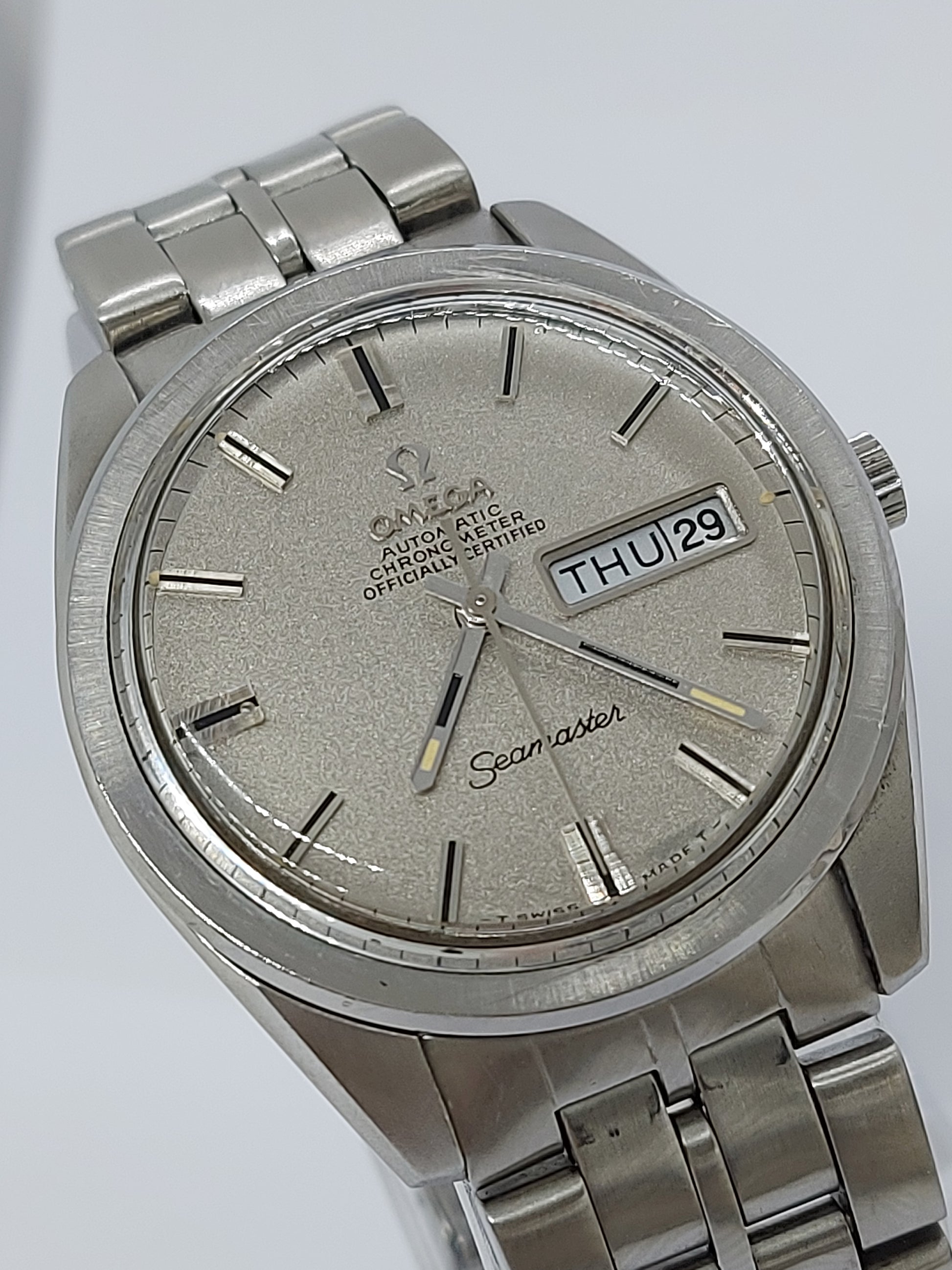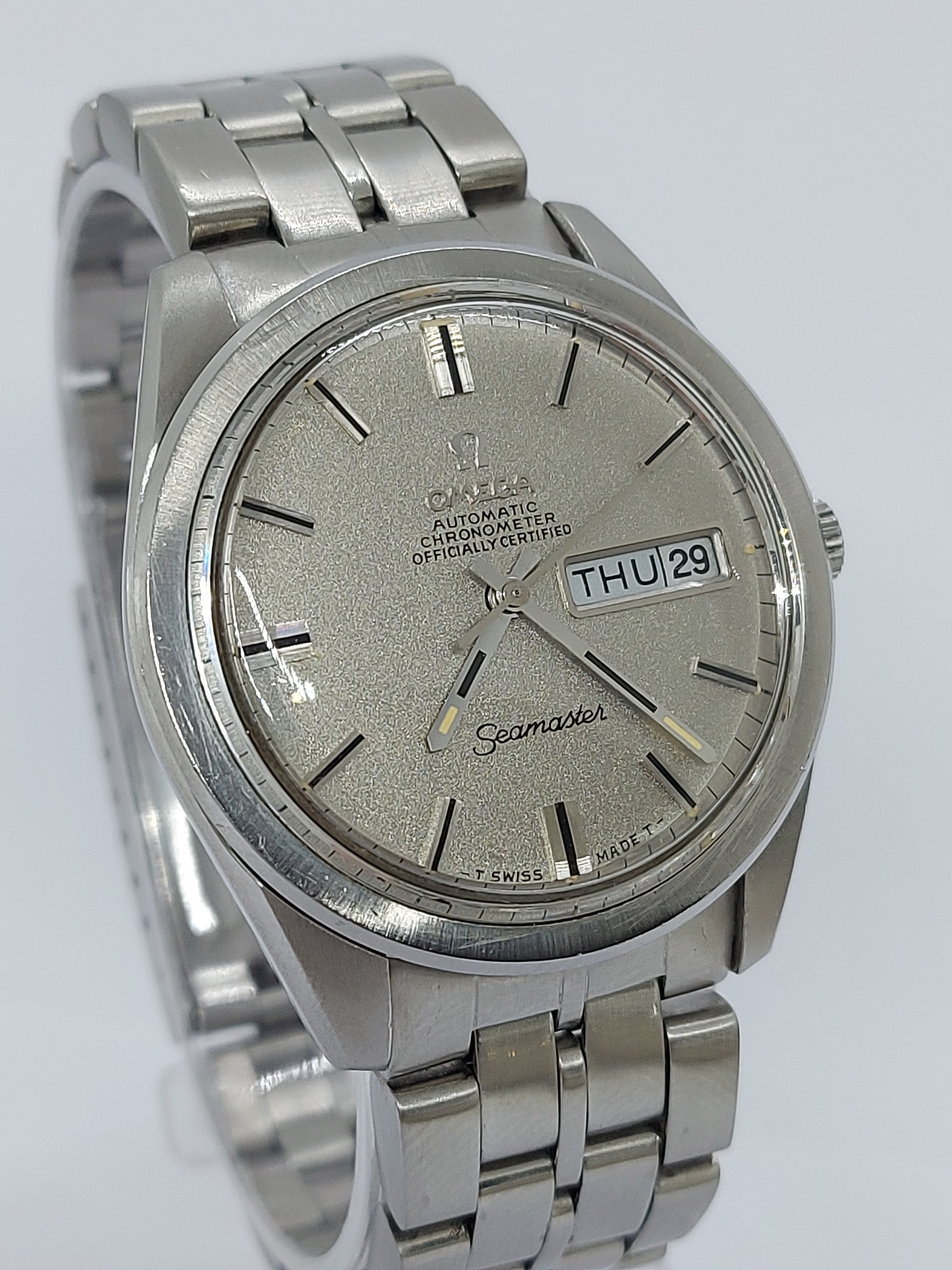 ✨ A rare and elegant Omega Seamaster automatic chronometer from 1969, powered by the highly regarded Omega Caliber 751 – featuring both day and date display. The stainless steel case measures 37 mm (excluding crown) and is paired with its original Omega bracelet and signed crown. A limited edition chronometer-grade piece representing the pinnacle of Omega’s late '60s craftsmanship.