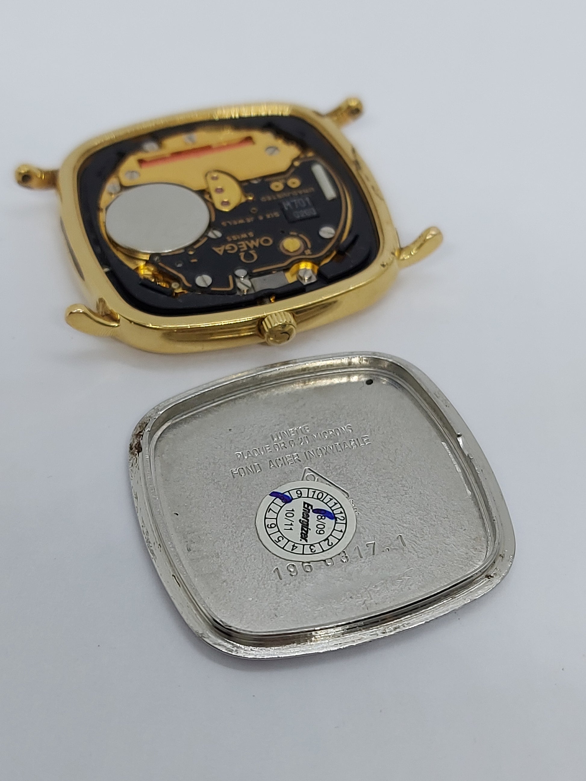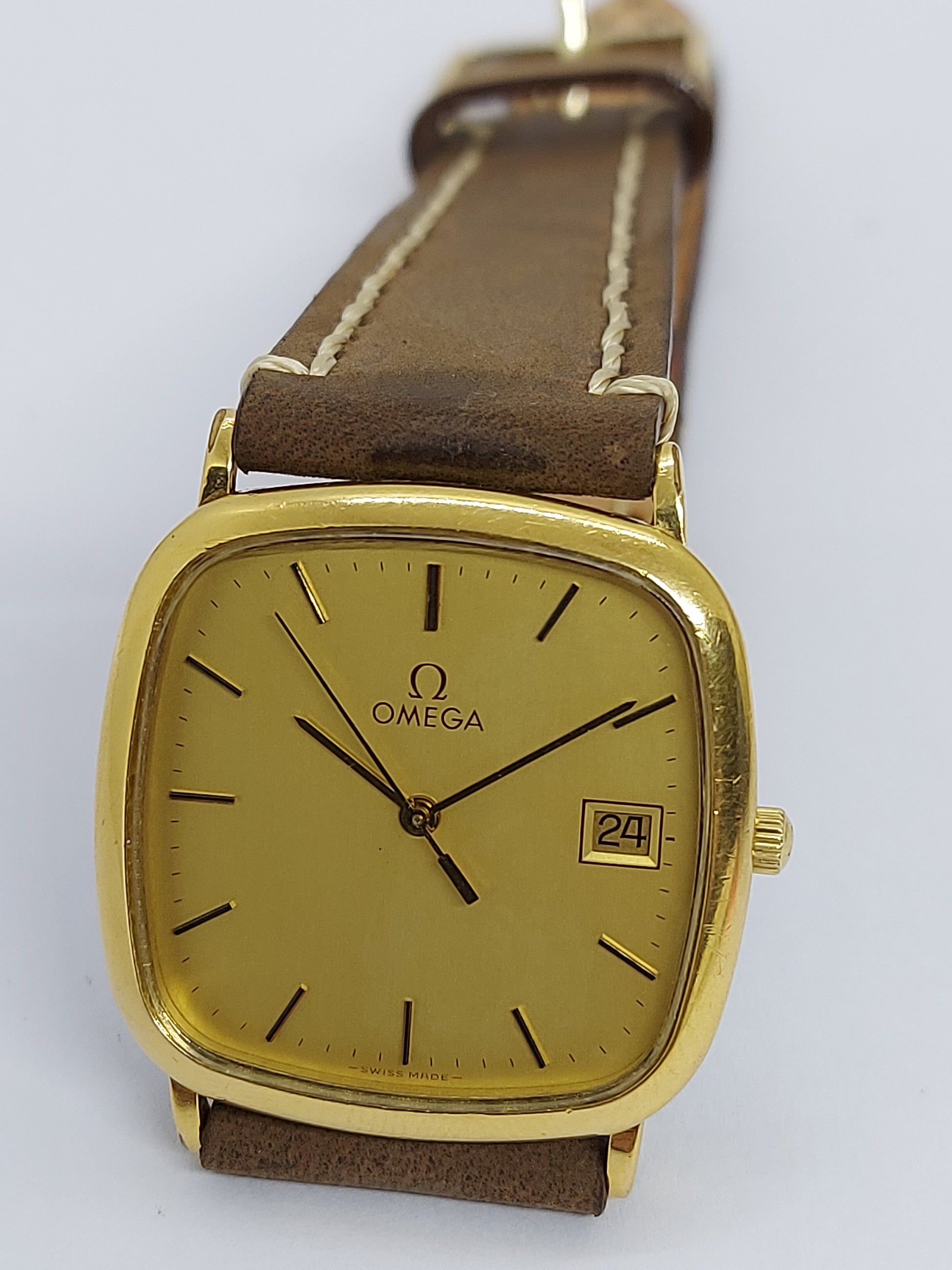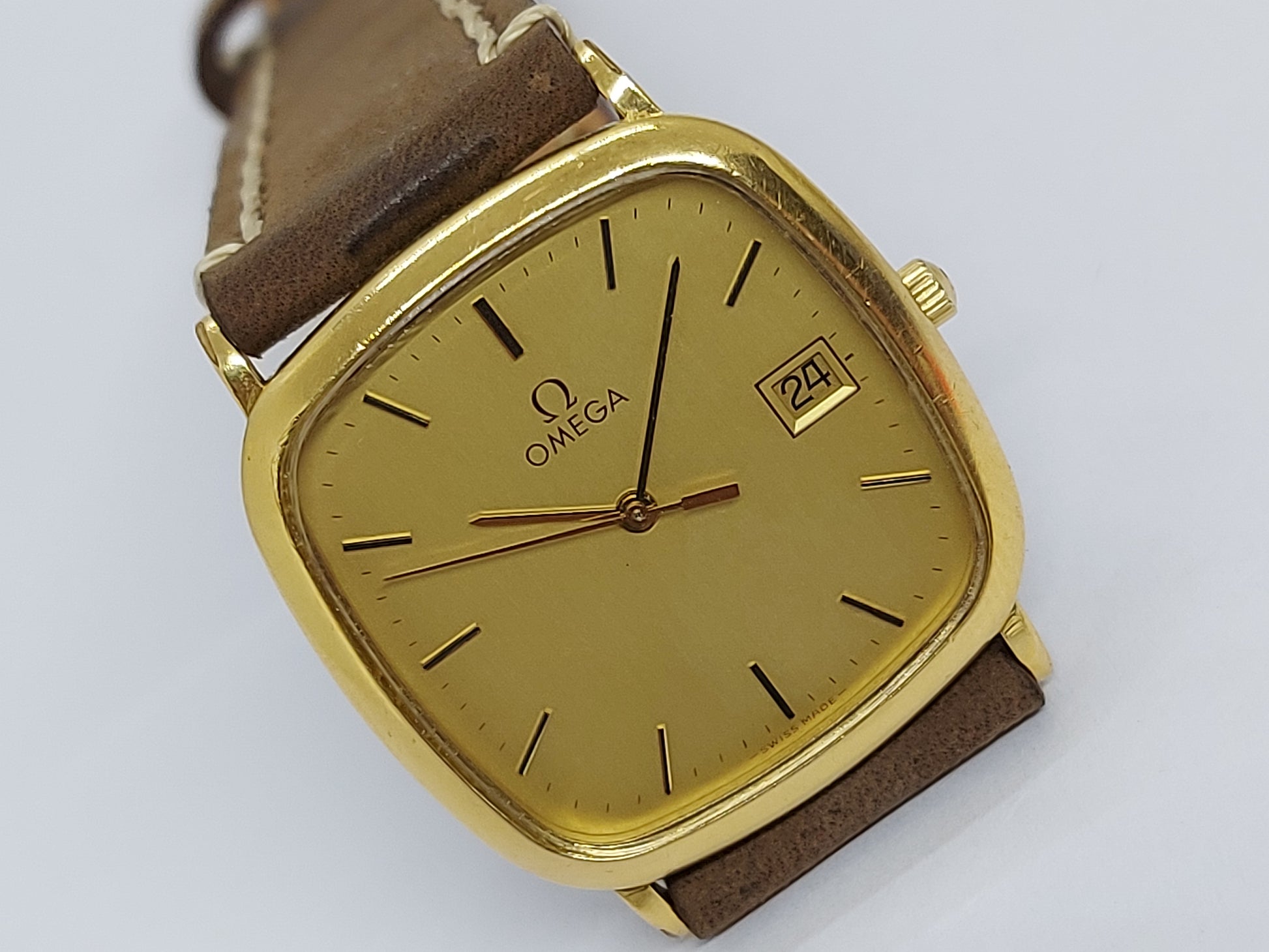 Authentic Omega De Ville Quartz men’s watch from 1980, featuring a classic square gold-plated case with a clean minimalist dial and date window. A refined example of Omega’s elegant design language from the late 20th century.